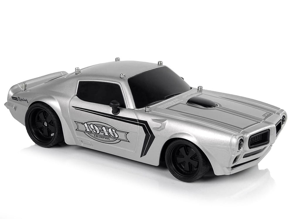 Samochód będzie się pięknie prezentował na wyścigowych trasach w domu!  Model wykonany jest w skali 1: 18.  Auto posiada lekką i wytrzymałą konstrukcję, sportowy design z czarnymi szybami i czarnymi detalami na masce oraz naklejkami 1946 Champion. Gumowe opony gwarantują przyczepność do podłoża podczas sterowania. Kierowanie pojazdem sprawia wielką frajdę zwłaszcza najmłodszym, dlatego pilot załączony w zestawie pozwoli pokierować mały modelem auta, posiada dwa osobne przyciski do jazdy w przód/ tył i na boki.