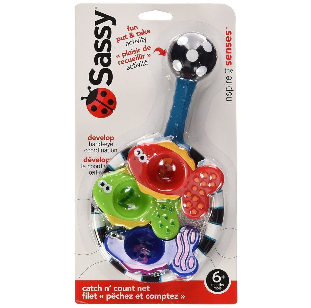 Kolorowe rybki i siatka z wygodnym uchwytem mają rozmiar dopasowany do małych, dziecięcych rączek. Ponumerowane rybki posiadają dziurki, by zasysać wodę i tworzyć wodne fontanny. Produkt jest odporny na pleśń i łatwy w czyszczeniu.