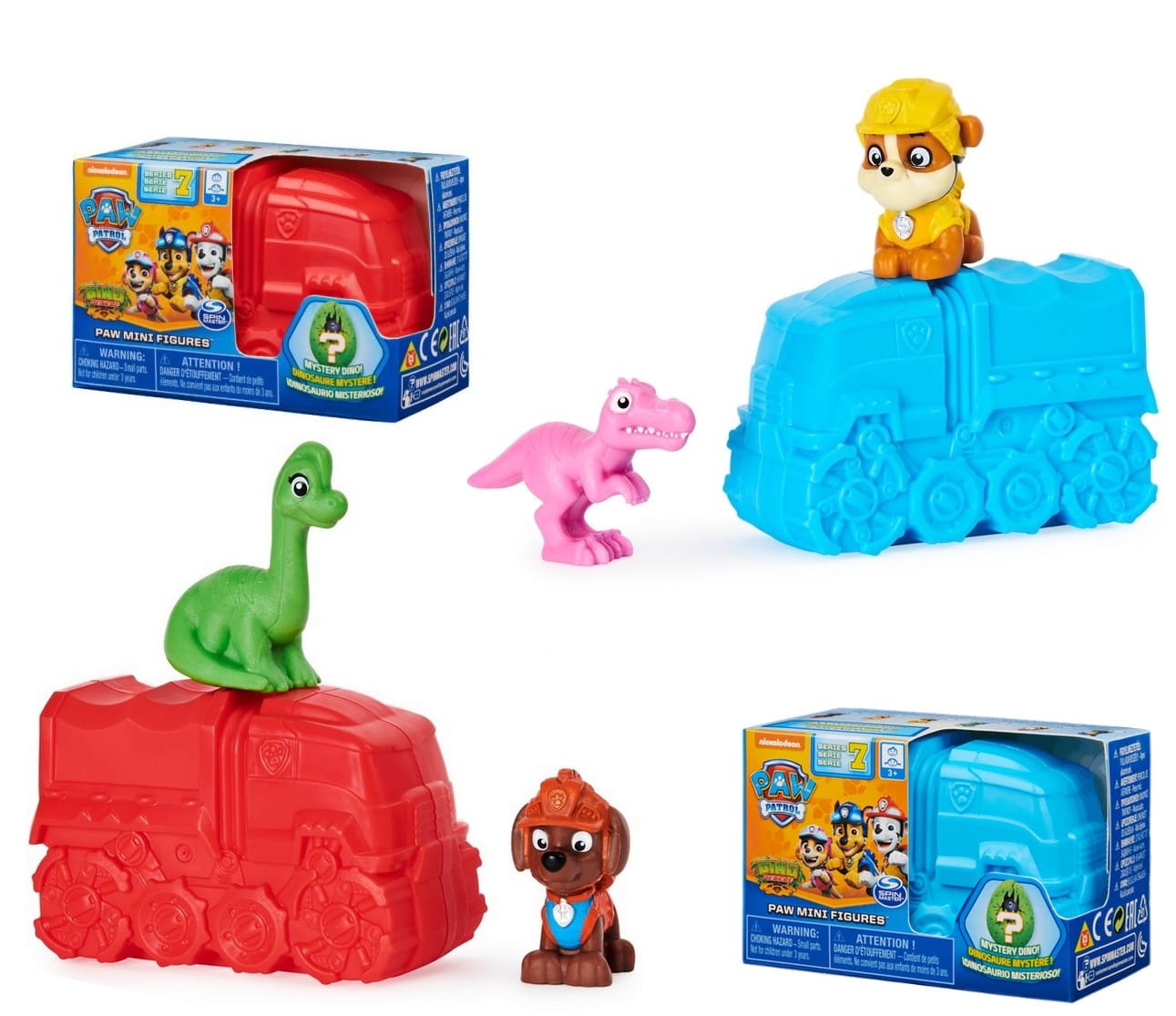 W zestawie znajdują się: 2 x mini figurka Psi Patrol (niespodzianka), 2 x mini figurka dinozaura (niespodzianka), 2 x opakowanie w kształcie pojazdu (w kolorze niebieskim i czerwonym).