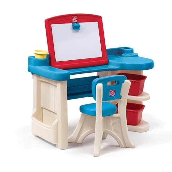 Biurko z krzesełkiem i sztalugą amerykańskiej firmy Step2 będzie świetnym pomysłem dla malucha. Mebelek idealnie sprawdzi się dla każdego małego artysty. Biurko posiada półeczki, schowek, sztalugę z klipsem, organizery na kredki czy też flamastry, w zestawie znajdują się dwa duże organizery, które pomieszczą wszystkie niezbędne akcesoria dziecka. Dopełnieniem zestawu jest wygodne krzesełko z oparciem.