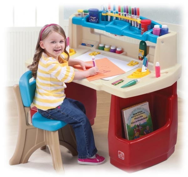Stabilne biurko firmy Step2 posiada dużą powierzchnię roboczą, zapewniając dziecku komfort i wygodę podczas użytkowania. Duża ilość różnego rodzaju przegródek i schowków gwarantuje utrzymanie miejsca pracy dziecka zawsze w należytym porządku. Biurko posiada mocowany ruchomy blat, który jest zarazem sucho ścieralną tablicą wielokrotnego użytku, na której dzieci mogą pisać flamastrami (do tablic sucho ścieralnych). Pod blatem znajduje się dodatkowy schowek, w którym dziecko może przechowywać swoje prace artystyczne jak np. malunki, rysunki. Powyżej blatu znajduje się półka, którą można wykorzystać do przechowywania kredek, nożyczek, flamastrów itp. Pod półką zamontowana jest lampka z włącznikiem (zasilana 3 bateriami typu AAA – nie załączone) zapewniająca prawidłowe oświetlenie biurka. Podpory/nogi posiadają obszerne schowki zapewniające dodatkową przestrzeń do przechowywania książek i zeszytów. Do zestawu dołączone jest wygodne krzesełko z oparciem. Biurko wymaga minimalnego montażu przez osobę dorosłą. Jest łatwe w utrzymaniu w czystości, przeznaczone do użytku zarówno wewnątrz, jak i na zewnątrz.
