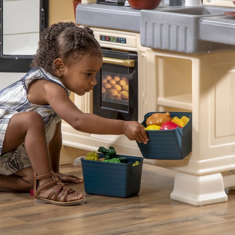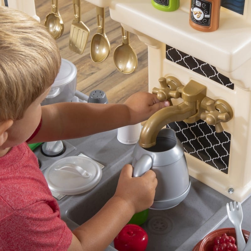Rewelacyjny kącik kuchenny w stylu klasycznym od amerykańskiej marki Step2 to idealne miejsce do zabawy dla dzieci. Kuchnia wyposażona jest w efekty świetlne i dźwiękowe a w zestawie znajduje się wiele akcesoriów, które zapewnią dzieciom godziny zabawy. Dzięki dużym rozmiarom z kuchni może korzystać więcej niż tylko jedno dziecko. Taka kuchnia zachwyci każdego małego kucharza i zachęci do kreatywnej zabawy. W skład zestawu wchodzi: kuchenka, piekarnik, zlewozmywak z kranem, okap, blat z dołączonym krzesełkiem, przy którym goście mogą spożywać serwowane potrawy, ekspres do kawy, lodówka, akcesoria kuchenne ( alerze, sztućce, pojemniki do przechowywania, pojemniki na przyprawy i sosy, garnek, patelnia).