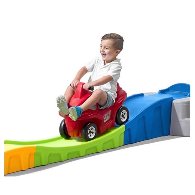 Góra zjazdowa dostarczy ogromnej frajdy każdemu dziecku. Długość zjazdu wynosi 3 metry. W górnej części toru znajdują się wgłębienia, dzięki którym wózek (pojazd) jest unieruchomiony i stabilny podczas wsiadania dziecka. Po obu stronach toru znajdują się antypoślizgowe schodki. Zabawkowy samochodzik na kółkach w stylu ATV ma wysokie oparcie, poręcz i podnóżki zapewniające bezpieczną jazdę po torze. Wszystko to sprawia, że zabawa jest bezpieczna. Pojazd może być użytkowany również poza torem zjazdowym - może służyć jako jeździk dla dziecka.