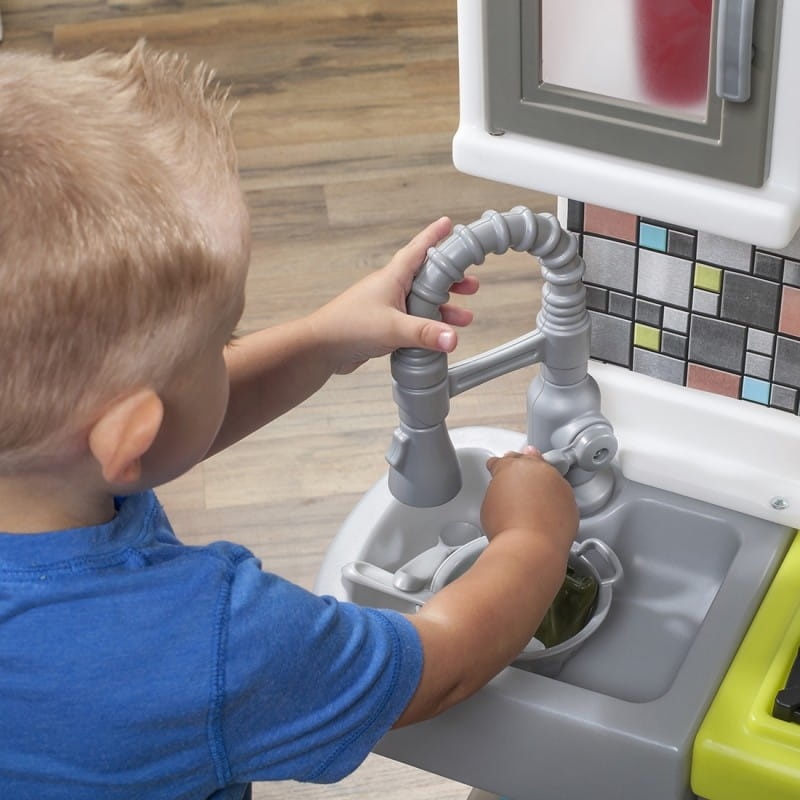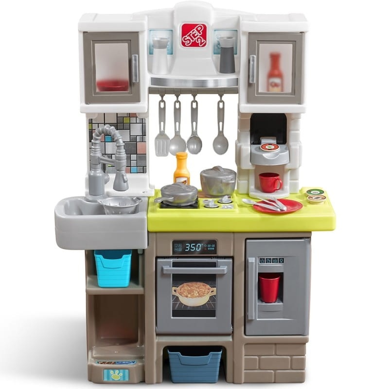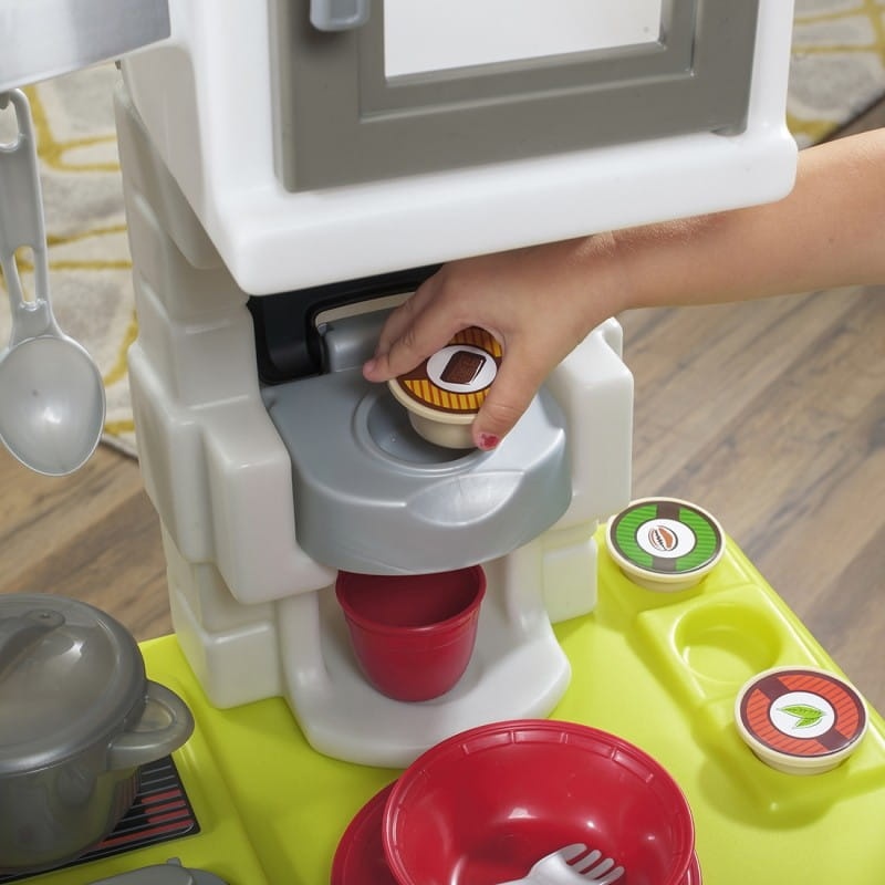 Kompaktowa kuchnia współczesnego szefa kuchni od firmy STEP2 wyposażona jest w interaktywny elektroniczny palnik ze światłami i zabawnymi dźwiękami gotowania! Ponadto realistyczna stylistyka w tej dziecięcej kuchni do zabawy naśladuje modny wygląd i styl dzisiejszego nowoczesnego wystroju kuchni. Zrób filiżankę ulubionej kawy za pomocą wbudowanego ekspresu do kawy i jednorazowych saszetek! W  zestawie jest nawet karma dla zwierząt i stacja wody, idealna do spędzania czasu z ulubionym pluszakiem. Gdy zabawa dobiegnie końca, wiele dużych szafek i pojemników do przechowywania sprawi, że ten zestaw będzie wyglądał schludnie.