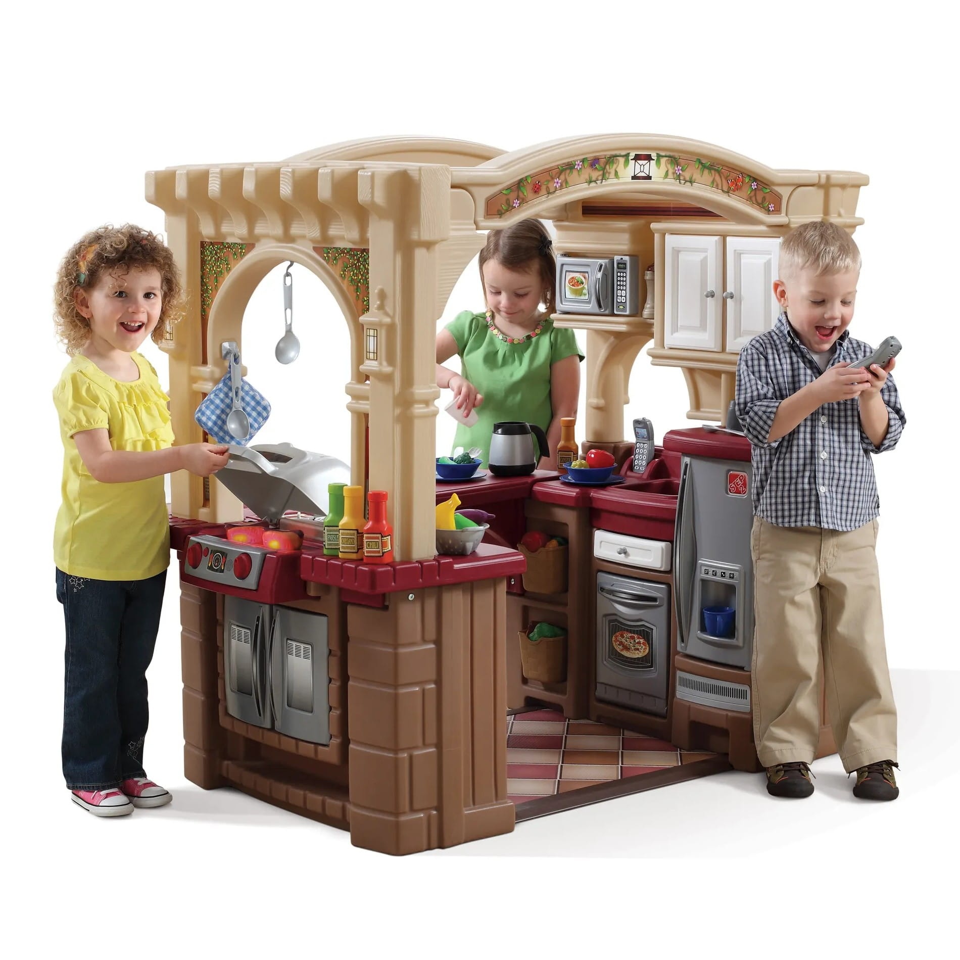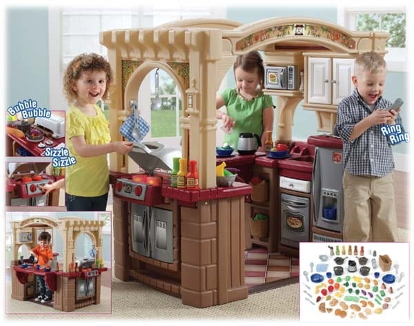 Wejdź do środka, aby odkryć trzy różne strefy zabawy. Kuchnia posiada podłogę, białe szafki, urządzenia „ze stali nierdzewnej”  a także bardzo duży, funkcjonalny blat, który może posłużyć do spożywania posiłków. Włącz realistyczne światła i dźwięki palnika kuchenki a następnie użyj wbudowanego zlewu z obrotowym kranem, aby umyć naczynia po kolacji. Dodatkowo ta duża kuchnia jest wyposażona w bogaty, bo aż 103-częściowy zestaw akcesoriów, dzięki którym dzieci mogą rozpocząć przygotowywanie posiłków.