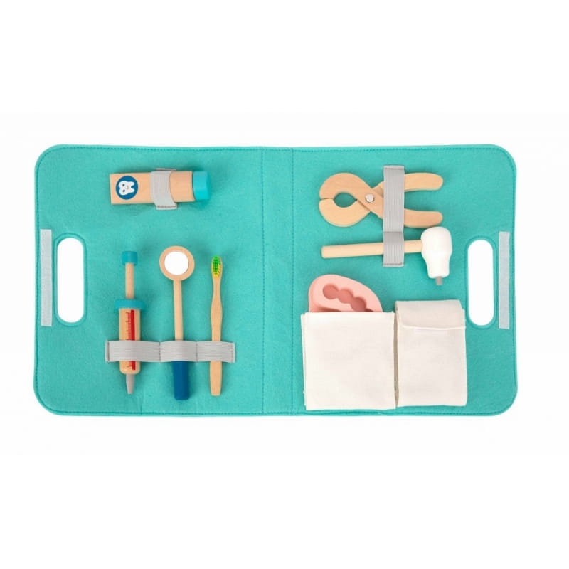 Drewniane narzędzia w torbie dla małego dentysty od marki TOOKY TOY to zestaw, który zawiera wszystko, czego potrzebuje Twój maluszek do zabawy w dentystę. Przyszli stomatolodzy mogą robić zastrzyki, wyrywać oraz sprawdzać stan zębów u swoich pacjentów. Zabawa w Dentystę to nie tylko jedna z zabaw na odgrywanie ról, to również nauka dbania o higienę oraz skutki jej braku. Uczy także empatii i współodczuwania, co jest bardzo ważne w relacjach społecznych. Wspiera rozwój wyobraźni i uczy rozwiązywania problemów.