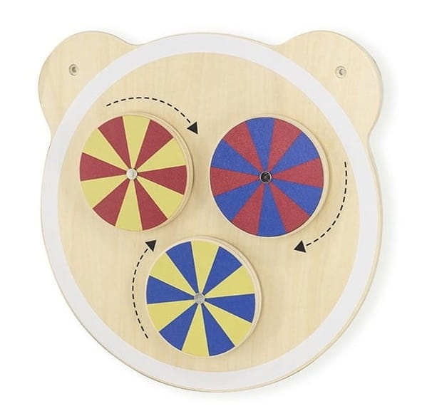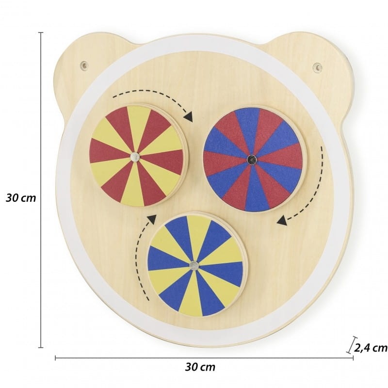 Jedna z serii drewnianych tablic z uroczą głową misia. Tablica z trzema kółkami, które zostały odpowiednio pomalowane, aby poprzez kręcenie wywoływać złudzenia optyczne. Zabawka pomaga w rozwijaniu logicznego myślenia u dzieci, pomaga również w nauce kolorów. Produkt idealnie sprawdzi się zarówno w domu, jak i w placówkach oświatowych, wczesnoszkolnych. Całość wykonana została z drewna lakierowanego i pomalowana nietoksycznymi farbami w żywe barwy, które zadowolą każdego użytkownika i dadzą mnóstwo radości z zabawy.