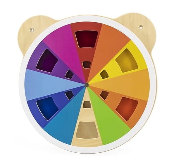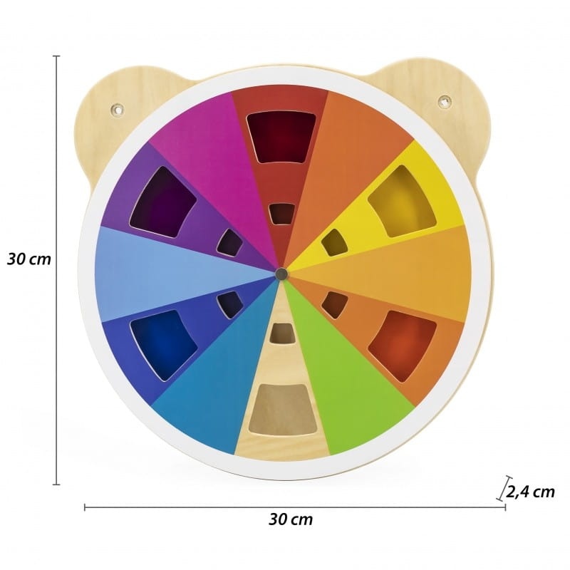 Jedna z serii drewnianych tablic z uroczą głową misia. Tablica z akrylową tarczą na przodzie w różnych odcieniach. Dziecko dzięki obracaniu tarczy tablicy może mieszać kolory w dowolny sposób i odkrywać jakie inne barwy powstają. W sumie można uzyskać 60 różnych kolorów. Produkt idealnie sprawdzi się zarówno w domu, jak i w placówkach oświatowych, wczesnoszkolnych. Całość wykonana została z drewna lakierowanego i pomalowana nietoksycznymi farbami w żywe barwy, które zadowolą każdego użytkownika i dadzą mnóstwo radości z zabawy.