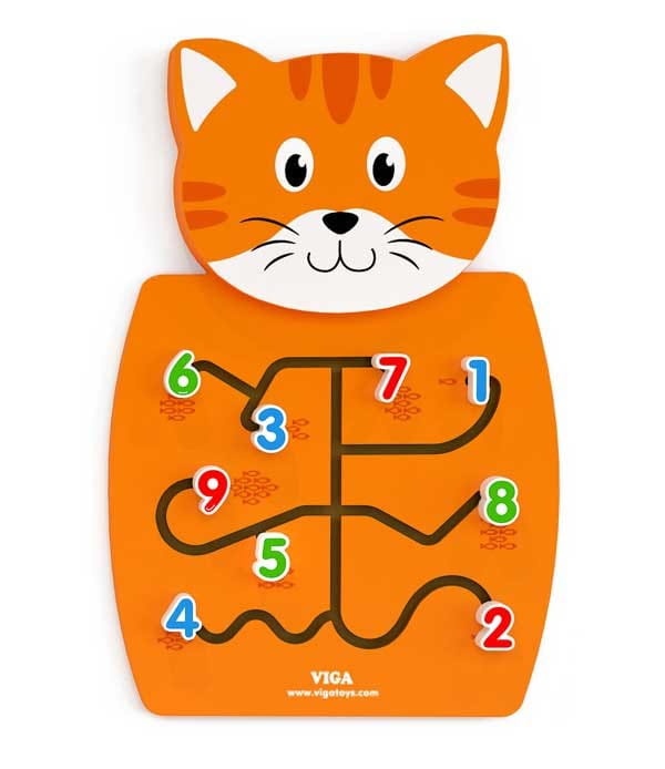 Drewniana zabawka sensoryczna Viga w kształcie przyjaznego kotka wprowadzi dziecko w ekscytującą zabawę. Kotek wyposażony jest w labirynt a zabawa polega na dopasowaniu cyferek do obrazków z odpowiednia ilością rybek. Zabawka została zaprojektowana tak, aby stymulować zmysły i wspierać rozwój motoryki dziecka. To doskonałe ćwiczenie zręczności małych paluszków. Zabawka uczy również logicznego myślenia oraz podstaw matematyki. Mocowanie zabawki do ściany pozwala zaoszczędzić miejsce na podłodze.