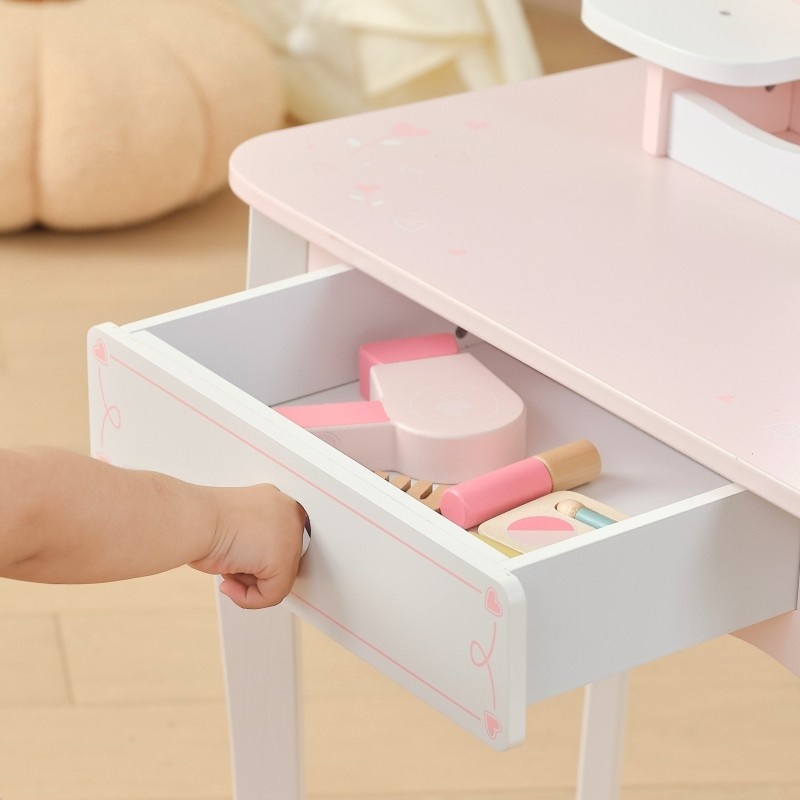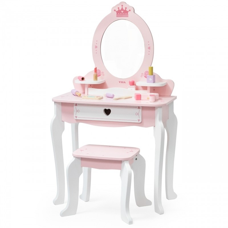 VIGA Duża Toaletka Drewniana Biało-Różowa z Lustrem i Krzesełkiem