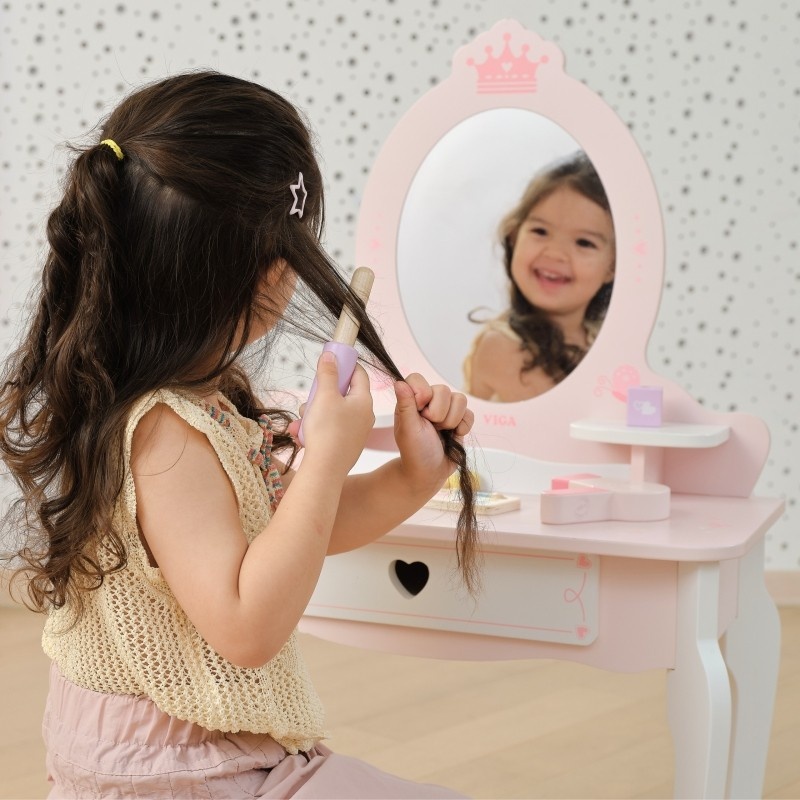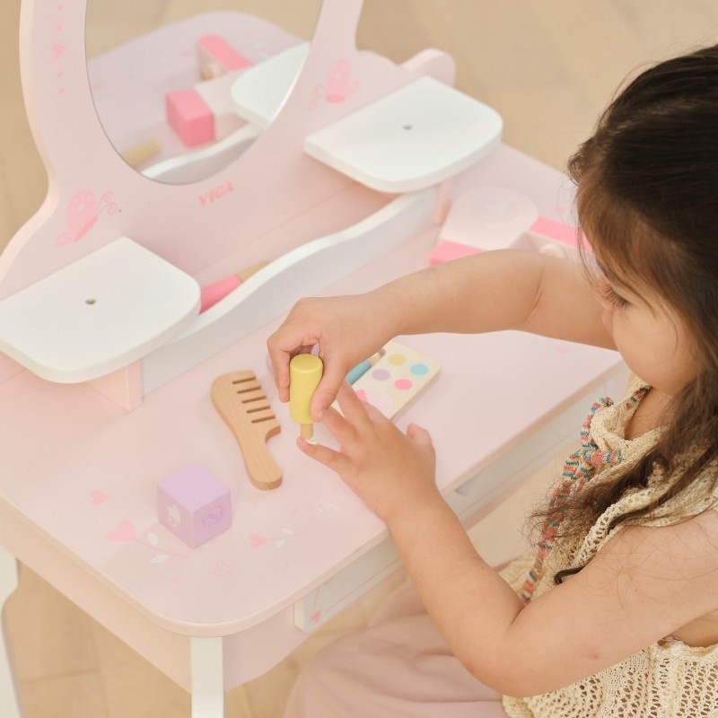 Duża Drewniana toaletka z marki Viga to wyjątkowa drewniana toaletka dla małej księżniczki, która spełni marzenia każdej dziewczynki! Wykonana z najwyższej jakości drewna, w delikatnych odcieniach różu i bieli, ta urocza toaletka zachwyca swoim bajkowym designem. Stylowe, zaokrąglone kształty, subtelne zdobienia i eleganckie nóżki sprawiają, że doskonale komponuje się w pokoju dziecięcym, dodając mu uroku i magii.Toaletka rozwija kreatywność, wyobraźnię i zachęca do odgrywania ról. Jest również doskonałym pomysłem na prezent – solidne wykonanie i estetyczny wygląd sprawią, że będzie służyć przez lata.