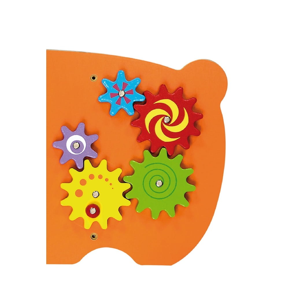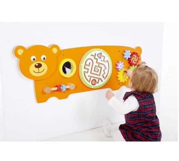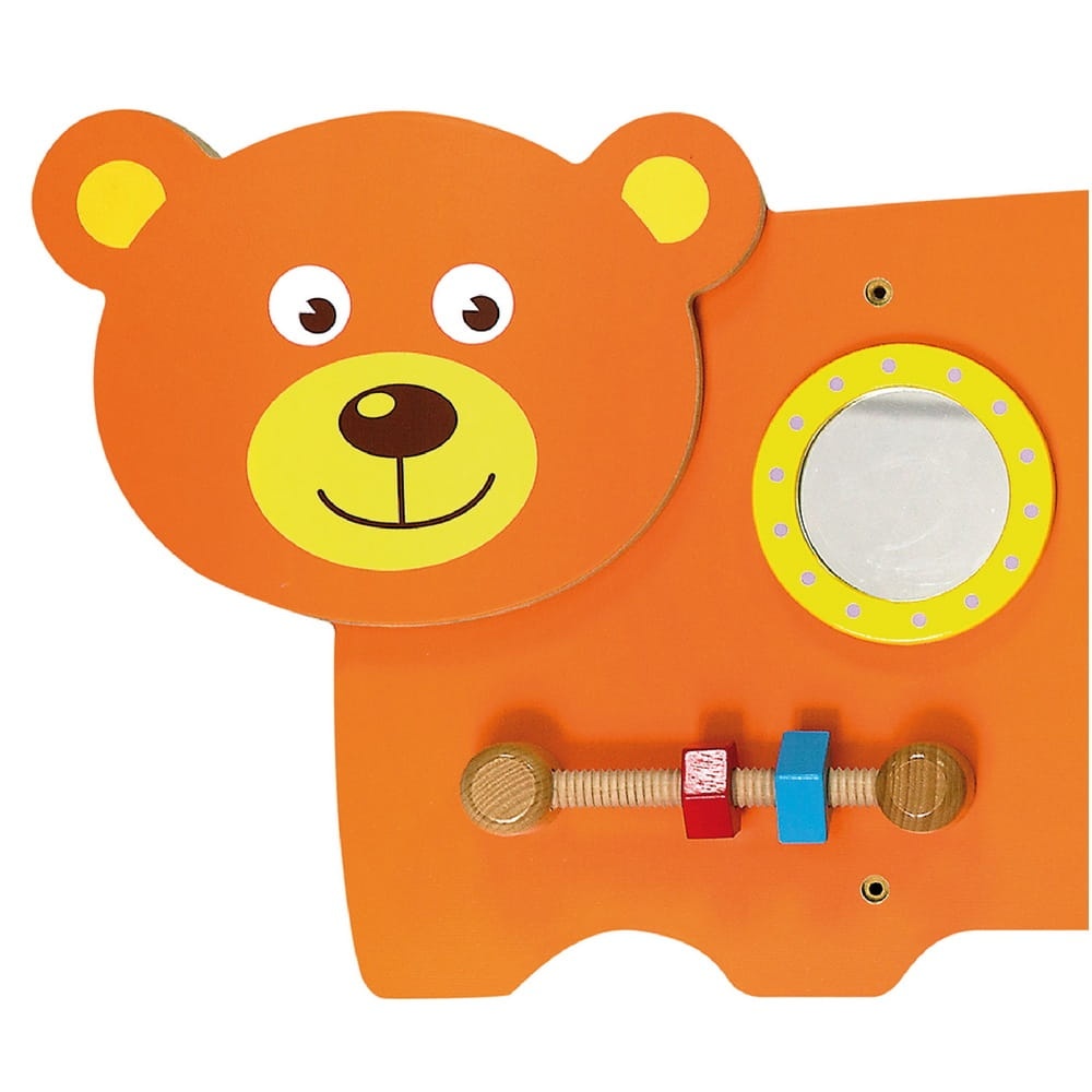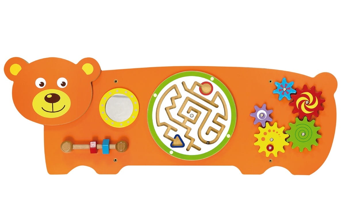 Miś marki Viga to drewniana, wielofunkcyjna zabawka na ścianę, która zapewni dzieciom godziny świetnej zabawy. Wśród różnych aktywności znajdziemy tutaj labirynt, kolorowe, ruchome trybiki, bezpieczne lusterko oraz nakrętki do przekręcania.
