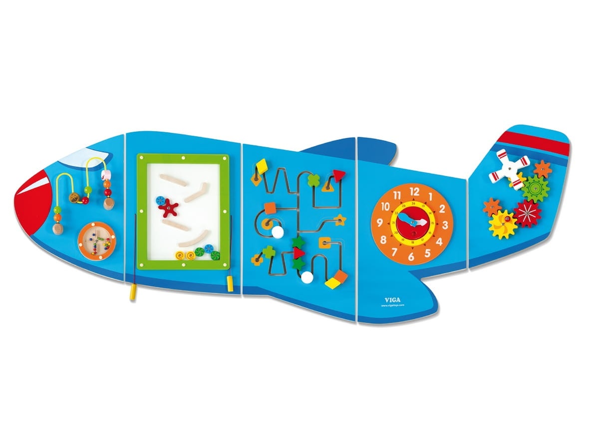 Samolot XL marki Viga to drewniana, wielofunkcyjna zabawka na ścianę. Całość składa się z 5 elementów, które w połączeniu tworzą samolot. Każdy element zapewni dzieciom inny rodzaj aktywności. Znajdziemy tutaj labirynt, przeplatankę (pętlę motoryczną), mini zjeżdżalnię, zegar z ruchomymi wskazówkami a także kolorowe, ruchome trybiki.