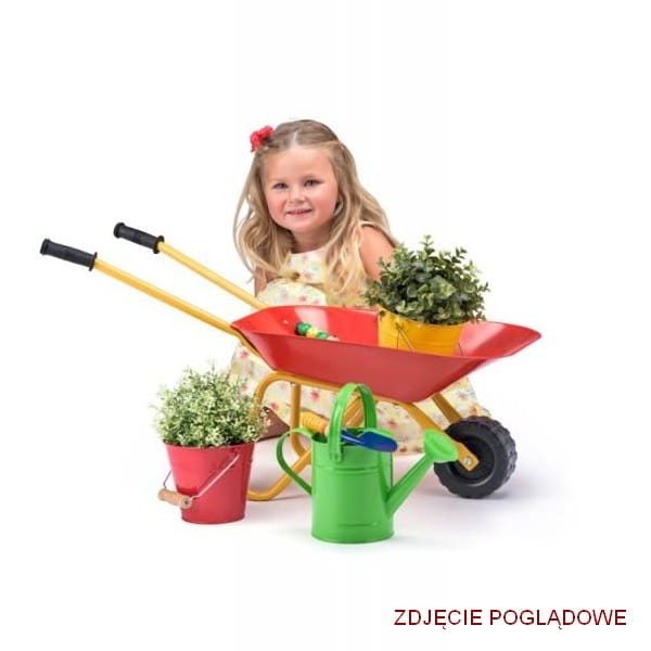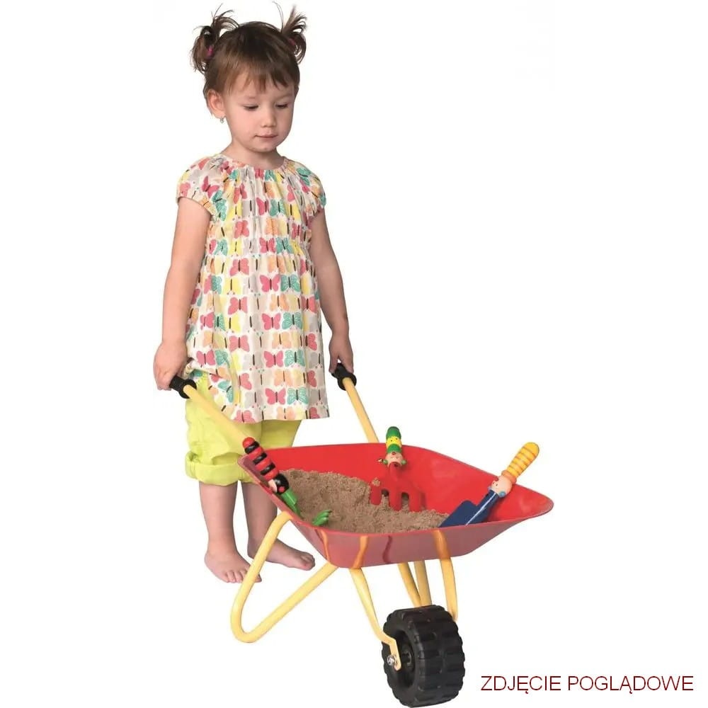 Czerwona metalowa taczka dla dzieci idealnie nadaje się do zabawy na dworze, jak i w domu. Przyda się zarówno podczas prac porządkowych w ogródku, jak i do załadunku różnych materiałów na "budowie". Można nią wozić piasek, zabawki czy inne skarby. Taczka posiada metalową ramę oraz metalową skrzynię ładunkową (misę), dzięki czemu jest niezwykle wytrzymała. Koło taczki wykonane jest z tworzywa sztucznego natomiast uchwyty są gumowe, zapewniając dziecku wygodne trzymanie.