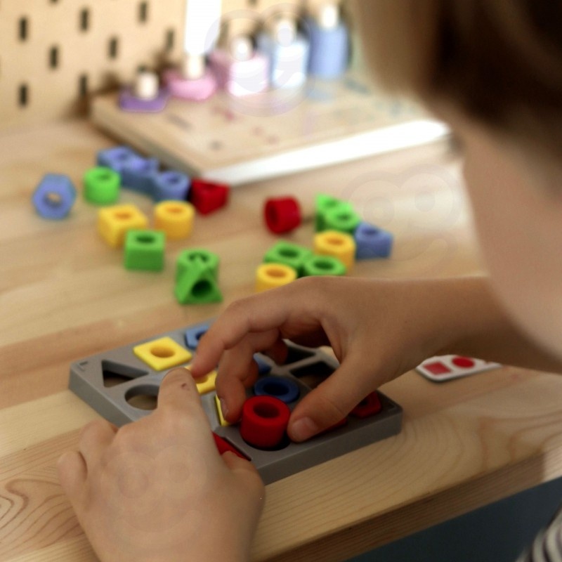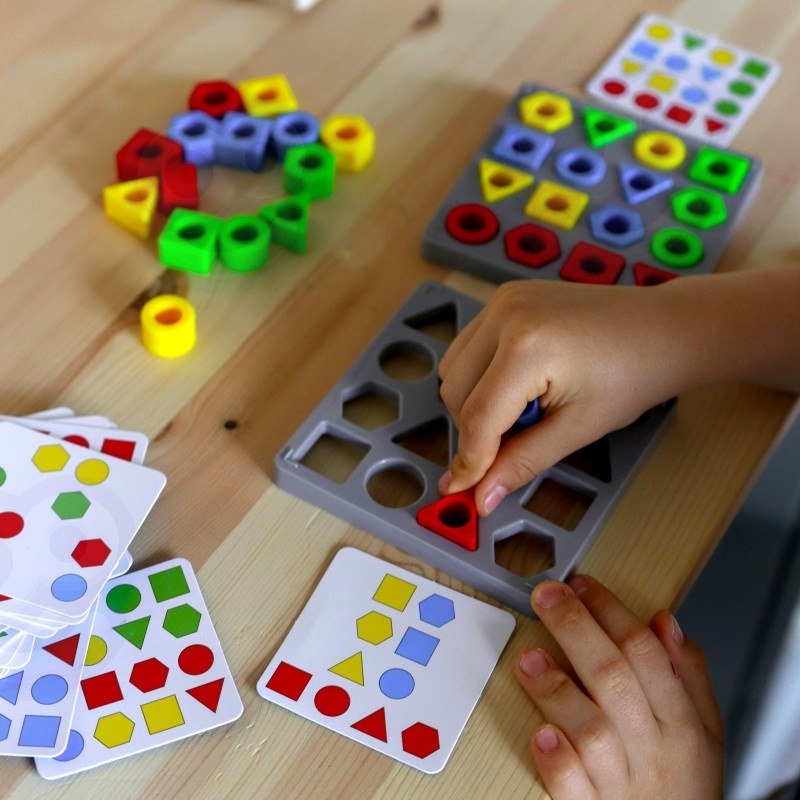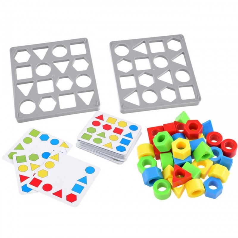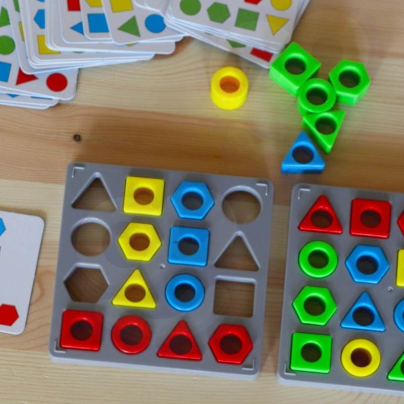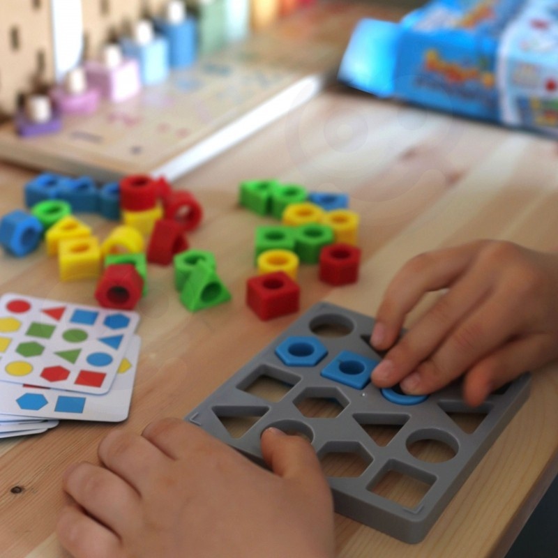 Zabawa polega na ułożeniu na podkładce wzoru, który został wylosowany przez gracza. Zgadzać musi się zarówno układ jak i kolory figur geometrycznych.