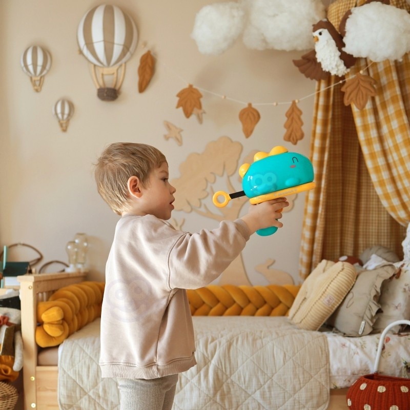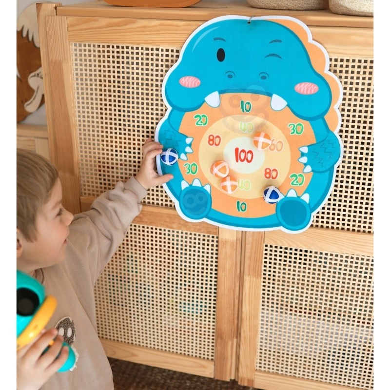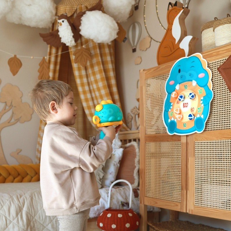 Przenieś zabawę w świat sympatycznych dinozaurów! Gra w Rzutki Pistolet Dinozaur marki Woopie to lekki wyrzutnik w kształcie dinozaura, który wystrzeliwuje miękkie, rzepowe piłki prosto w kolorową tarczę z punktami. Wystarczy nacisnąć spust, celować i trafiać w 100! Zestaw gwarantuje masę śmiechu, zdrową rywalizację i bezpieczną zabawę w domu.