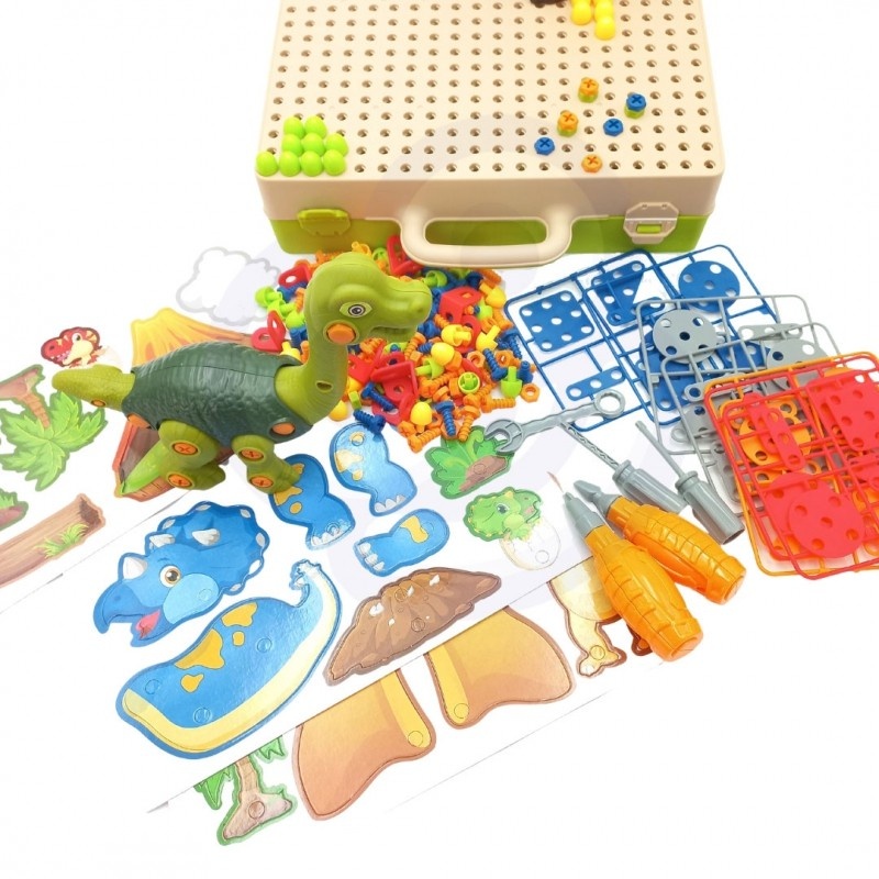 Zestaw konstrukcyjny w Walizce od znanej marki WOOPIE to idealna zabawka dla miłośników majsterkowania, który wprowadzi Twoje dziecko do czasów prehistorii. Dziecko może wykorzystać w pełni swoja wyobraźnię i kreatywność, ponieważ oprócz skręcenia dinozaurów, można ułożyć dowolna scenerie i dowolny obrazek na planszy. Plansze można złożyć w walizkę i przechowywać wszystkie elementy w środku. W zestawie znajdują się takie elementy jak śrubki, obrazki, zakrętki, śrubokręty, klucze i wiele innych. Do wszystkiego dołączona jest instrukcja jak złożyć dinozaury i przykłady wzorów do układania. Zabawka rozwinie zdolności manualne tzw "małą motorykę" - ruch rączek. Dinozaur to ponadczasowa tematyka uwielbiana przez wszystkie dzieci. Dzięki zabawie prehistorycznym stworzeniem maluch poszerzy zakres swojej wyobraźni i kreatywności.