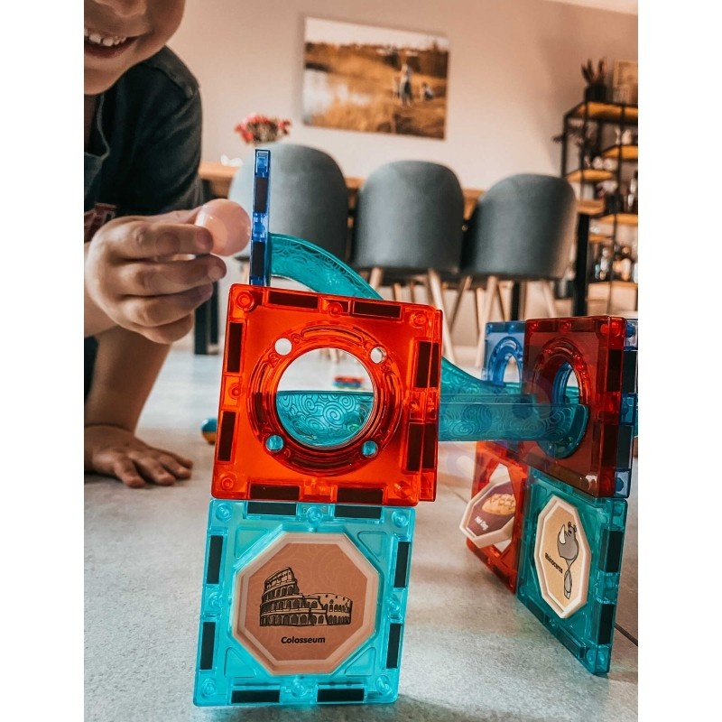Klocki Magnetyczne od marki WOOPIE zwrócą uwagę i zafascynują Twoje dziecko. Klocki w bardzo łatwy sposób łączą się ze sobą, można z nich stworzyć wspaniałe konstrukcje ze zjeżdżalniami np. tor po którym przemieszcza się kulka. Tor można podświetlić dołączoną latarką, aby robił jeszcze większe wrażenie, a samo dziecko może wtedy zaobserwować jak przemieszcza się światło, co rozwinie u niego percepcję. Samo ułożenie toru tak, aby kulki bez problemu dochodziły do końca rozwinie u dziecka logiczne myślenie, wyobraźnie, kreatywność oraz pozwoli skoncentrować się podczas tworzenia konstrukcji. Przez układanie klocków dziecko poznaje kształty i kolory oraz ćwiczy zdolności manualne tzw. motorykę małą.
