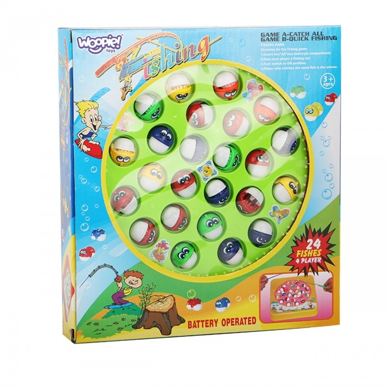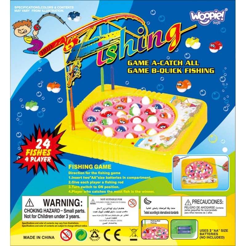 • - Zestaw zawiera: 4 kolorowe wędki, planszę do gry, 24 ryby