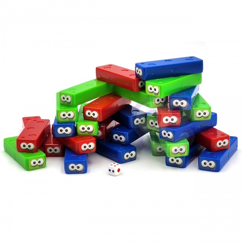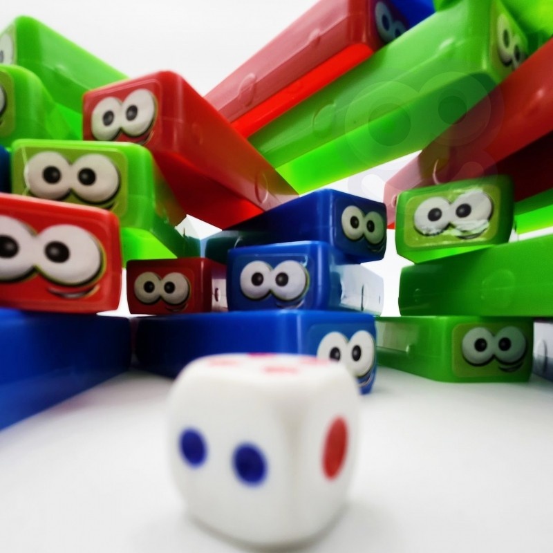 • Kolorowe klocki z oczami w 3 żywych barwach: czerwonej, zielonej i niebieskiej