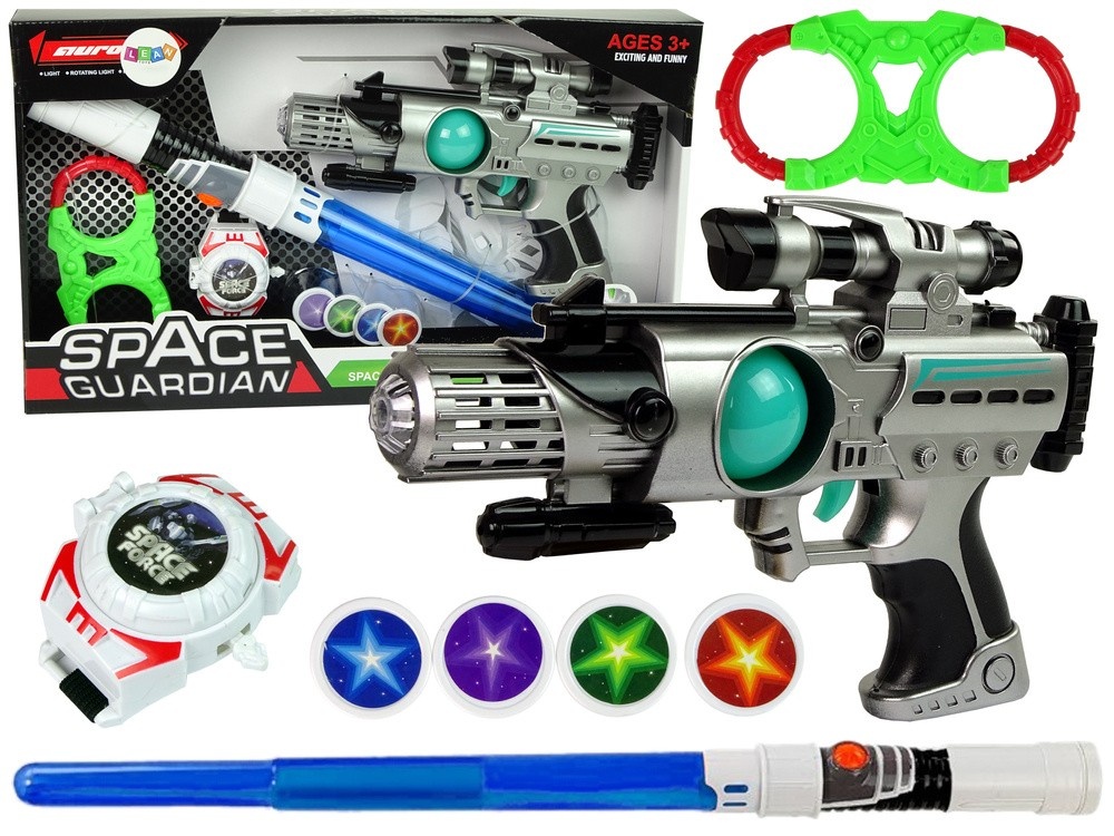 Zestaw Wojownika Kosmosu Pistolet Laserowy Miecz Świetlny Kajdanki Miotacz Dysków